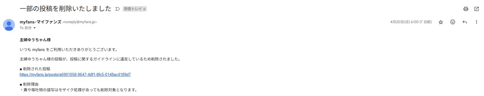 たとえばこの投稿の削除理由が糞や嘔吐物ってことなんですが、結論からいうとどちらもあてはまらない。問い合わせしてもお返事がいただけない。
